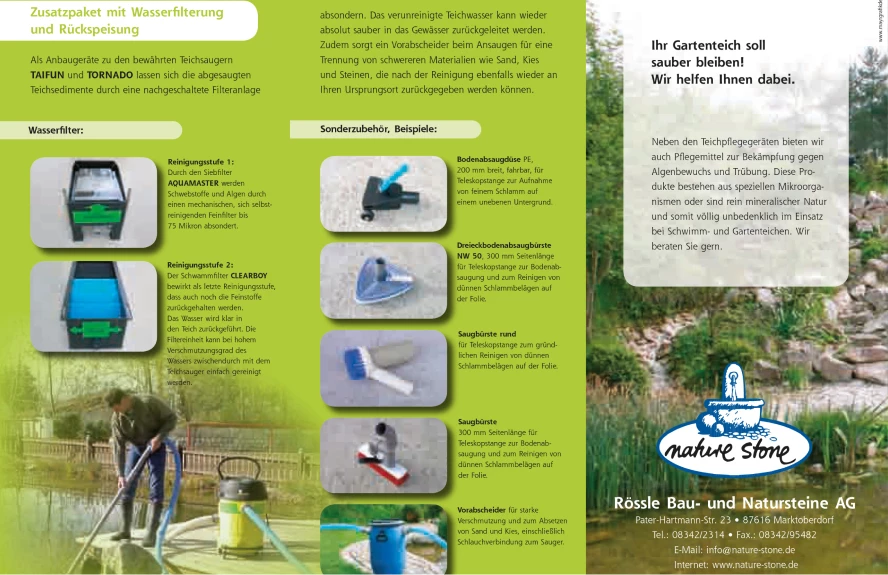 2004Beginn des Vertriebs von Nass- und Schlammsaugern als HändlerVon Garten- & Landschaftsbauern kam immer häufiger die Nachfrage, wie Sie in Teichen verbaute Natursteine einfach und unkompliziert reinigen können. So wurden erste Teichreinigungsgeräte ins Produktsortiment aufgenommen.