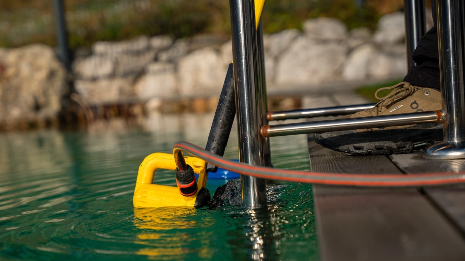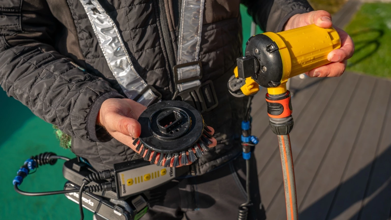 Die BIMBI 11 Bürste steht für eine effiziente, leichte und vor allem chemiefreie Reinigung – selbst an schwer zugänglichen und verwinkelten Stellen. Durch ihre kompakte Bauweise eignet sie sich ideal für Treppen, Ecken und Filterbereiche im Teich, aber auch für Holzdecks, Abdeckungen, Duschbereiche, Caravans oder Boote. Der integrierte Wasseranschluss ist mit allen gängigen Gardena-Schlauchsystemen kompatibel und ermöglicht die Reinigung sowohl im als auch außerhalb des Wassers. Die Speedcontrol-Funktion steuert die Laufrichtung der Bürste und sorgt so für optimale Reinigungsergebnisse. Unterschiedliche Bürstenaufsätze in verschiedenen Härtegraden bieten maximale Flexibilität für unterschiedliche Oberflächen. Dank werkzeuglosem Klick-System lassen sich die Bürsten schnell und mühelos wechseln. Der bewährte Teleskopstangenanschluss ermöglicht eine komfortable Anwendung auch an schwer erreichbaren Stellen. Die BIMBI 11 ist wahlweise mit Akku oder Netzteil erhältlich. Zudem kann zwischen einer Teleskopstange von 1,6–3,0 m oder 2,5–5,0 m Länge gewählt werden. Für Besitzer einer BISAM- oder BIBER-Bürste von Rössle mit vorhandener Teleskopstange und Stromzufuhr ist die BIMBI 11 auch ohne Stromversorgung und Stange erhältlich – alle Komponenten sind innerhalb des Systems universell kompatibel. Lieferumfang: - BIMBI 11 Bürstenkopf mit weicher schwarzer Bürste - Transportkoffer - TRIOVAL GFK 1,6-3,0m Teleskopstange - SpeedControl Schaltereinheit - Akku 24V 4Ah - Akku Schnellladegerät - Gürteladapter mit Tragegurt Technische Daten: - Integrierter Wasseranschluss "Gardena" für die Wasserzuführung - Arbeitsbreite: 11 cm - Laufzeit pro Akkuladung ca. 2-3 h - Akku-Ladezeit ca. 1 h