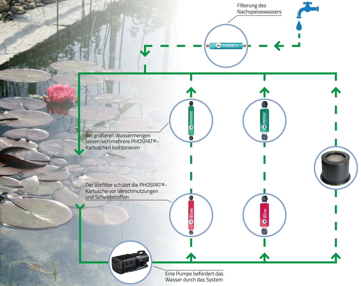 Zu viel Phosphat im Wasser bedingt meist eine verminderte Wasserqualität. Phosphate gelangen beispielsweise über Nachfüllwasser und Fischfutter in den Teich oder entstehen durch das Verfaulen organischer Anteile im Wasser. Die im Wasser vorhandenen Phosphate bilden den Nährstoff für unerwünschte Trübungen im Gewässer. Um die Wasserqualität zu verbessern, ist eine Reduzierung des Phosphatwertes notwendig. PHOSPAT® 3 Filterpatrone zur langfristigen Phosphatreduktion. Durch die Phosphatreduktion wird das Wasser klarer und der Biofilter wird in seiner Arbeit unterstützt. Die Filterpatrone ist besonders geeignet für Schwimmteiche, Naturpools und Koiteiche mit einem Wasservolumen von bis zu 150 m³. Für die Filterung größerer Wassermengen können mehrere Filterpatronen kombiniert werden. Die Aufnahmekapazitäten liegt beim PHOSPAT® 1 bei 270 g PO4³. Für eine optimale Filterwirkung schließen Sie den PHOSPAT® 3 an eine Pumpe mit einer Leistung von ca. 2.500 l/h an. PHOSPAT® 3 - Filterpatrone zur langfristigen Phosphatreduktion im Gewässer - Besonders geeignet für Schwimmteiche, Koiteiche und Naturpools mit einer Wasserkapazität von bis zu 150 m² - Aufnahmekapazität von 270 g Phosphat - Optimale Filterwirkung bei Verwendung einer Pumpe mit einer Leistung von ca. 2.500 l/h - Für die Filterung größerer Wassermengen kombinierbar mit weiteren Filterpatronen - Druckbeständig bis max. 4 bar