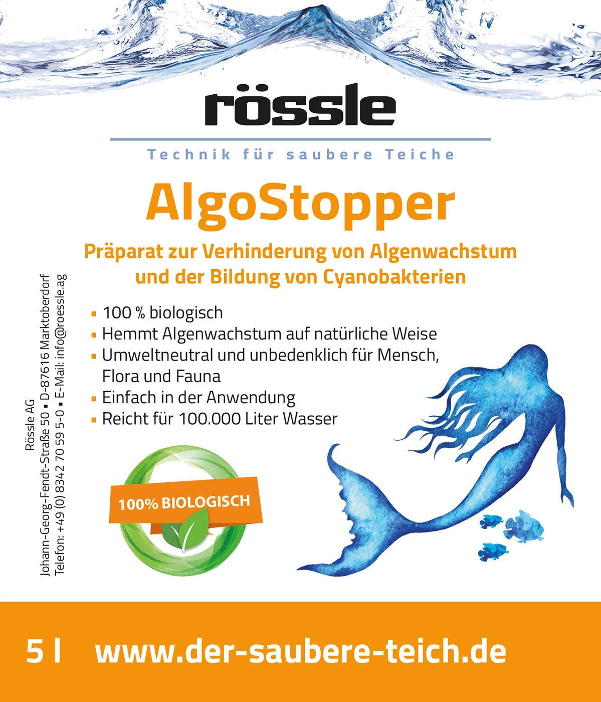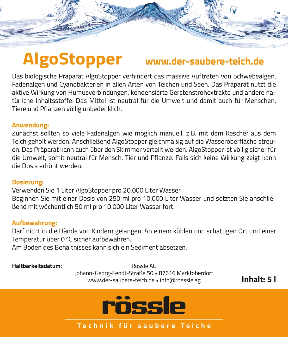 AlgoStopper, 5 l, ist ein biologisches Präparat, das massives Auftreten von Schwebealgen und Fadenalgen und die Bildung von Cyanobakterien verhindert. Das Mittel ist umweltneutral und unbedenklich für Menschen, Tiere und Pflanzen. Dosierung: Beginnen Sie mit einer Dosis von 250 ml auf 10.000 l Wasser und setzten Sie anschließend mit wöchentlich 50 ml fort. Holen Sie zunächst so viele Fadenalgen wie möglich manuell aus dem Teich. Anschließend das Präparat gleichmäßig auf die Wasseroberfläche streuen oder über den Skimmer verteilen.