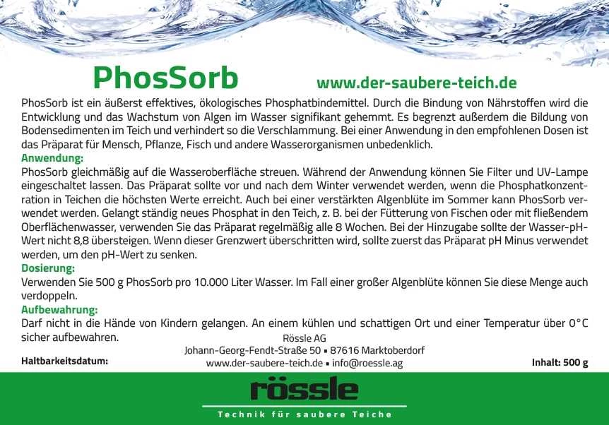 PhosSorb, 500 g, ist ein äußerst effektives, ökologisches Phosphatbindemittel. Es begrenzt außerdem die Bildung von Bodensedimenten im Teich und verhindert so die Verschlammung. Bei korrekter Dosierung ist PhosSorb unbedenklich für Menschen, Tiere und Pflanzen.
