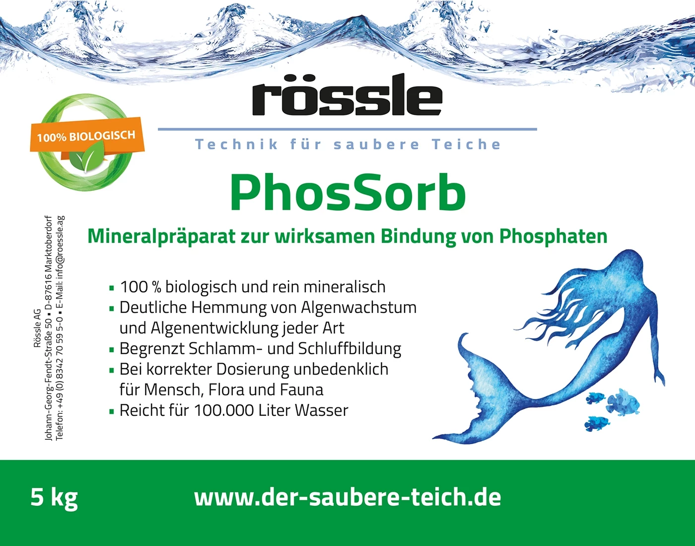 PhosSorb, 5 kg, ist ein äußerst effektives, ökologisches Phosphatbindemittel. Es begrenzt außerdem die Bildung von Bodensedimenten im Teich und verhindert so die Verschlammung. Bei korrekter Dosierung ist PhosSorb unbedenklich für Menschen, Tiere und Pflanzen. Dosierung: Holen Sie zunächst so viele Fadenalgen wie möglich manuell aus dem Teich. Verstreuen Sie dann PhosSorb gleichmäßig auf der Wasseroberfläche. Das Präparat sollte vor und nach dem Winter verwendet werden, wenn die Phosphatkonzentration in Teichen die höchsten Werte erreicht. Auch bei einer verstärkten Algenblüte im Sommer kann PhosSorb verwendet werden. Verwenden Sie 500 g PhosSorb pro 10.000 Liter Wasser. Im Fall einer großer Algenblüte können Sie diese Menge auch verdoppeln.