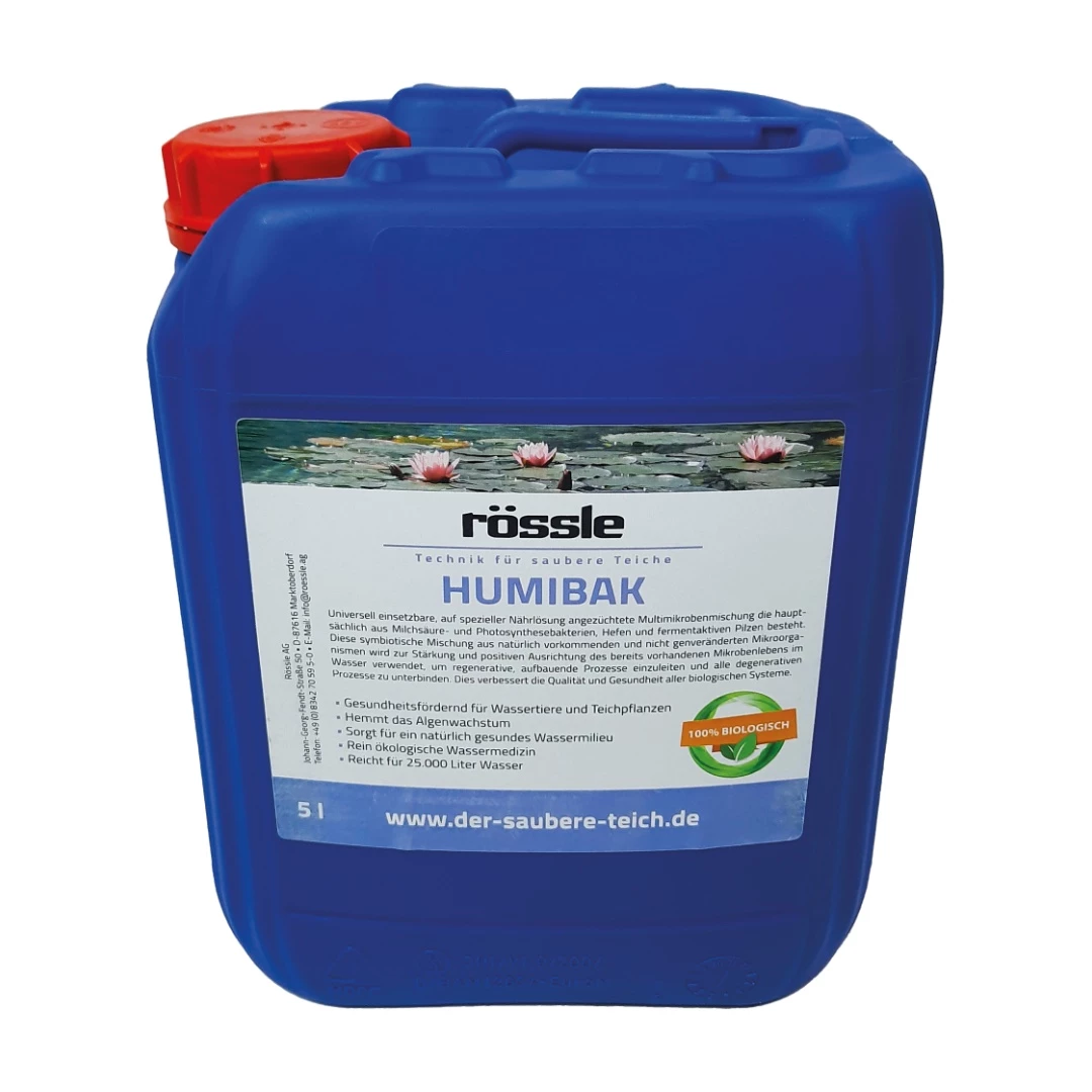 Sie haben sich entschieden, ein biologisches Gewässer zu betreiben, kein Gift, kein Chlor. Dennoch können sich Probleme breitmachen, die zu Trübungen, Algen oder übermäßiger Sedimentation führen. Gewisse Teichmittel in flüssiger oder auch in Pulverform können die Stabilität erhöhen und den Zustand des Teiches verbessern. So finden sich hier im Shop einige phosphatbindende Mittel, die der Alge die Nahrungsgrundlage entziehen oder zumindest reduzieren. Es gibt pH-regulierende Stoffe wie auch die symbiotischen, bakteriellen Züchtungen für ausgewogenes Teichmilieu, wie unser seit Jahrzehnten beliebtes HUMIBAK. Finden Sie hier den für Ihr Naturwasser geeigneten Zusatz, um die maschinelle Reinigung zu ergänzen.