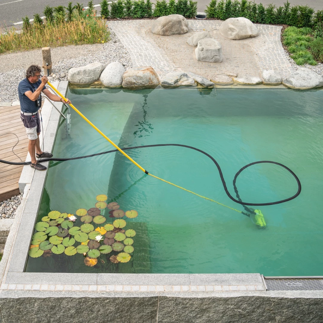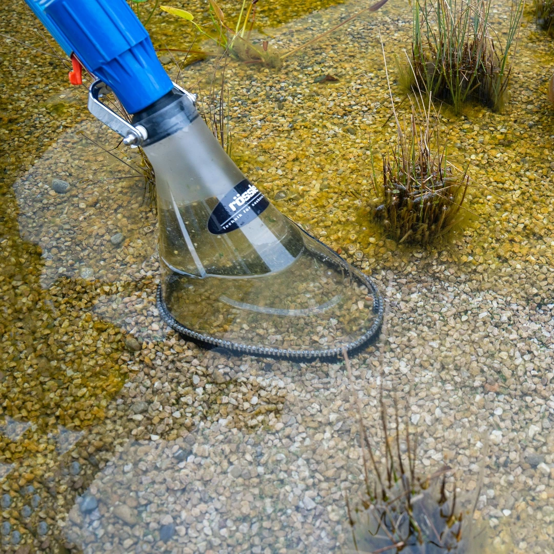 Die erste Reinigung im Jahr nach der Winterpause geht vielfach mit einigen Sedimenten und Rückständen einher, die über die kühleren Monate einige Zeit hatten, um regelrecht zu kompostieren. Die organischen Anteile zerlegen sich dann in feinste Bestandteile mit einigem Nährstoffanteil. Wenn jetzt der Fehler begangen wird und lediglich anteilig Partikel gesammelt werden, beispielsweise mit dem Roboter oder anderen wasserrückführenden Geräten, werden die zuvor schön im Sediment gebundenen Phosphate im gesamten Gewässer verteilt. Dies wird in vielen Fällen Algenwuchs, der sogenannten „Eutrophierung“, münden. Das heißt, Frühjahrs-Erstreinigungen sollten grundsätzlich durch eine Wasser verwerfende Reinigung stattfinden, um Phosphate im Gewässer zu reduzieren, statt nur umzuwälzen. Diese Empfehlung stammt von den Limnologen, sprich Wasserpäpsten, und ist eine erprobte und sichere Weisheit.