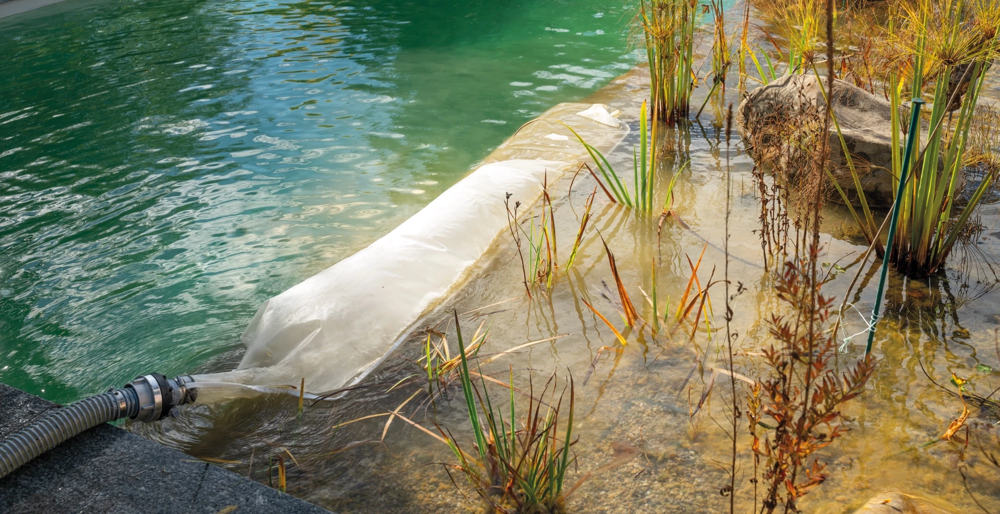 Um weniger Wasserverlust während der Gewässerreinigung zu erreichen, gibt es vielfach den Wunsch, das abgesaugte Teichwasser von den Schmutzpartikeln zu befreien und wieder dem Teich zurückzuführen. Dazu bieten wir zwei ganz verschiedene Produkte an. Zum einen finden Sie den Artikel Nr. SZ110 Feinfiltersack. Dieser etwa 200 x 30 cm große und 150 q feine Gewebesack wird mit dem Ablaufschlauchende gekoppelt. Der vorzugsweise im Flachwasser abgelegte Feinfiltersack hält greifbare Teile im Beutel zurück, während das Wasser in den Teich läuft. Feine Schwebeteile werden das Wasser zunächst trüben, dies klart aber relativ bald wieder auf.